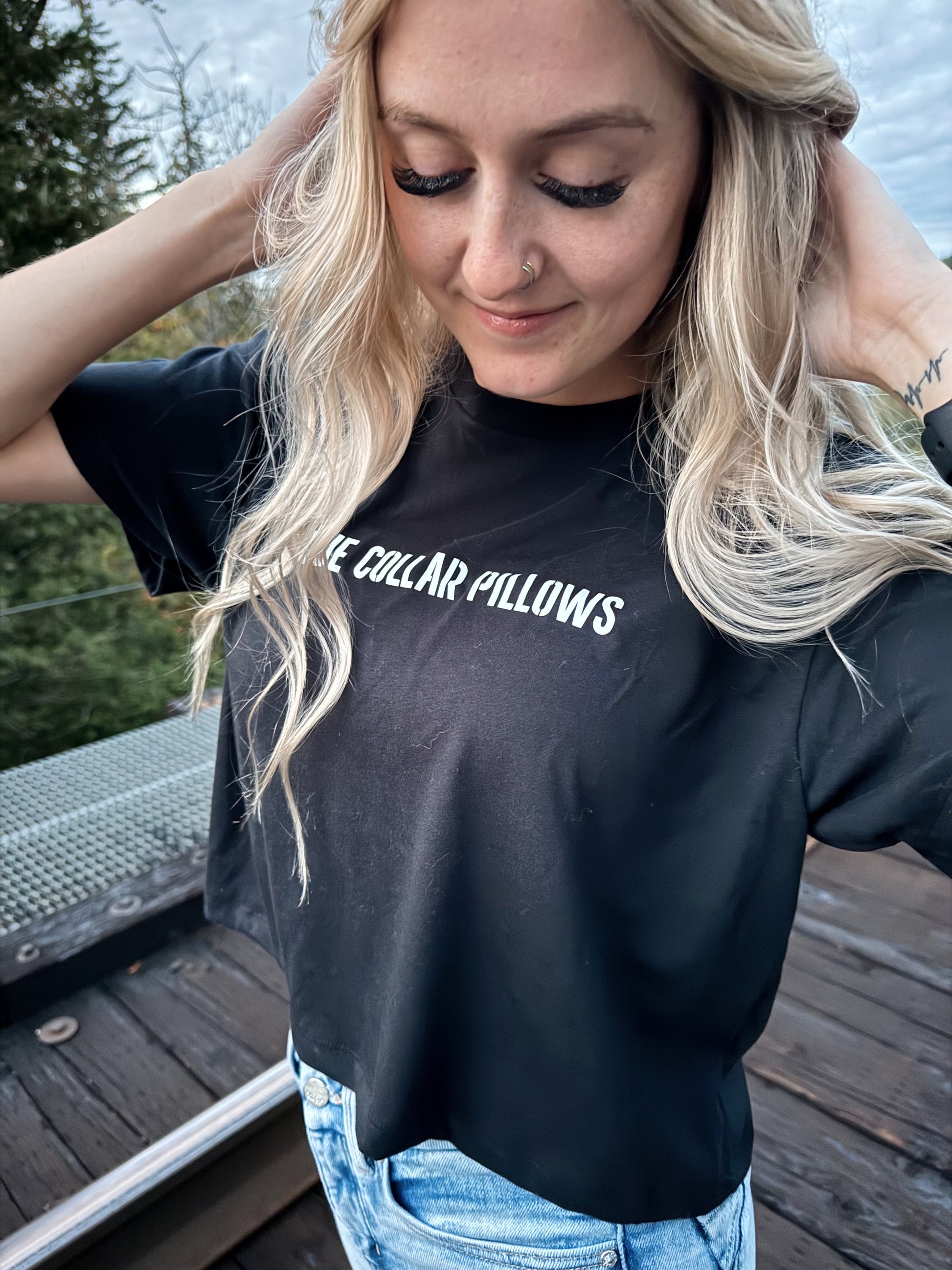 Semi-crop, t-shirt, black with white lettering, cute and stylish!